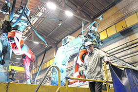 Внимание привлек еще один великан, который сваривает балки передней оси для самосвалов грузоподъемностью 220 и 240 тонн. В цехе он около восьми лет. Этот «киборг» также уникален: помимо автоматического подогрева детали перед сваркой, он еще осуществляет и лазерное слежение. На сварку одной балки робот тратит около 14 часов.