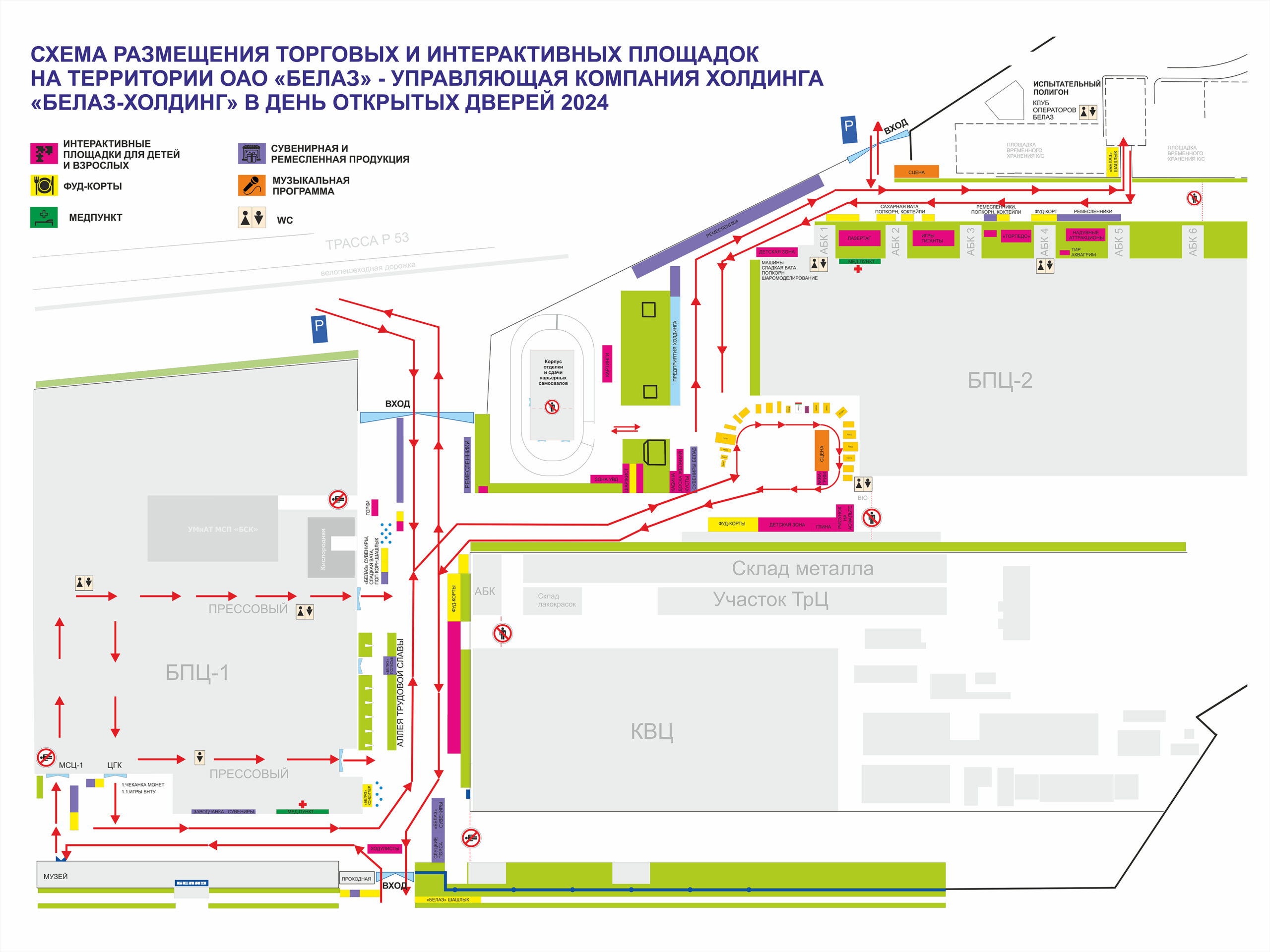 По всему маршруту движения посетителей будут располагаться интерактивные площадки, зоны активностей. Сразу у входа гостей начнут встречать ходулисты в красивых джазовых костюмах. Слева, вдоль заводоуправления, разместятся торговые точки общепита, фастфуд. Возле цеха главного конвейера будет проходить увлекательный мастер-класс «Чеканка монет». Под руководством опытного кузнеца любой желающий сможет с легкостью изготовить памятный сувенир – монету с изображением БЕЛАЗа. Здесь же будут работать игры Белорусского национального технического университета, напольные игры-гиганты, шаржист.
