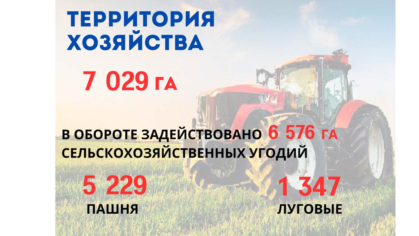 Территория хозяйства занимает земельную площадь в 7 029 гектаров. В хозяйственном обороте задействовано 6 576 гектаров сельскохозяйственных угодий из них 5 229 – пашня, 1 347 – луговые.