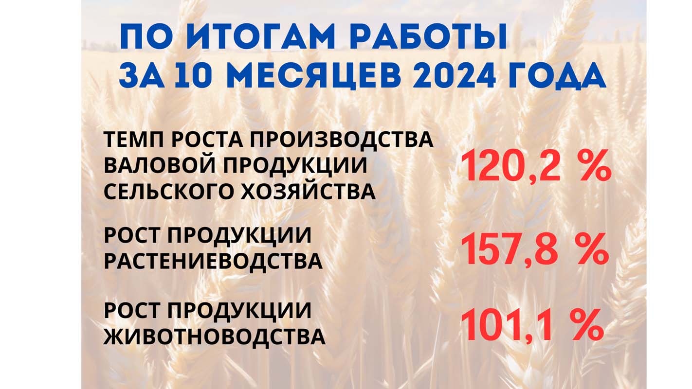 По итогам работы за десять месяцев текущего года темп роста производства валовой продукции сельского хозяйства в сопоставимых ценах к уровню прошлого года составил 120,2 процента, в том числе продукции растениеводства – 157,8 процента, животноводства – 101,1 процента. Получено 7 224 тонны зерновых и зернобобовых культур (188,7 %). Собрано 7 355 тонн кукурузы на зерно (217,7 %), 1 177 тонн рапса