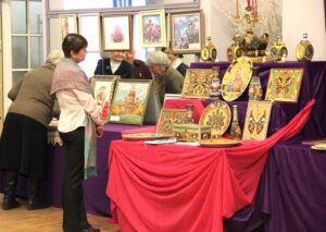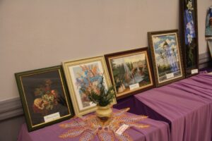 Где-то через год после моего прихода состоялась первая выставка декоративно-прикладного искусства «Краски осени». Для оформления экспозиции нам тогда отвели малый зал Дворца культуры. Работ ветеранов было очень много, они размещались и по периметру, и в центре зала. В день открытия выставки мы решили пригласить к нам Петра Александровича Пархомчика, тогда генерального директора БЕЛАЗа, который в тот день проводил в ДК прием как депутат областного Совета депутатов. Петр Александрович очень внимательно осмотрел все экспонаты, особенно понравились ему рушники с национальным белорусским орнаментом, вышитые Людмилой Владимировной Козловской и Валентиной Владимировной Перелыгиной. Даже отметил: «С такими рушниками и зарубежных гостей БЕЛАЗу было бы не стыдно хлебом-солью встречать». Задержался директор и у вышитого полотна «Первый бал Наташи Ростовой» авторства Галины Павловны Хоменок, пошутил: «И где здесь у нас Пьер Безухов?» Позднее мы проводили такие выставки ежегодно, они носили то же название, если проводились осенью, накануне Дня машиностроителя, и назывались «Январские узоры» или «Рождественская мозаика», если проходили зимой.