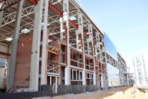 Сегодня каркас здания смонтирован, по его периметру ведется монтаж сэндвич-панелей, идет подготовка к устройству зенитных аэрационных фонарей на кровле здания, заливке фундамента.