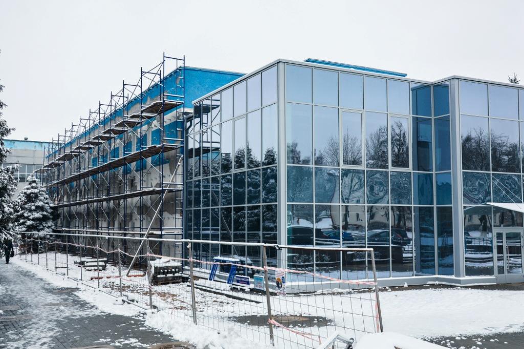 Возникли вопросы и по зданию бассейна: по его фасадам в ходе работ были обнаружены многочисленные трещины, намокания и разрушения участков стен со стороны чаши бассейна. Для выполнения первоначальных проектных решений по ремонту фасадов потребовались дополнительные работы по снятию штукатурных слоев и ремонту кирпичной кладки. Для надлежащей теплотехнической реабилитации, улучшения эстетического вида здания бассейна и его визуальной совместимости с новым зданием спортзала было принято решение об устройстве вентилируемого фасада здания бассейна из металлических панелей с утеплением стен. Cдача в эксплуатацию здания бассейна планируется в январе следующего года при своевременном финансировании.