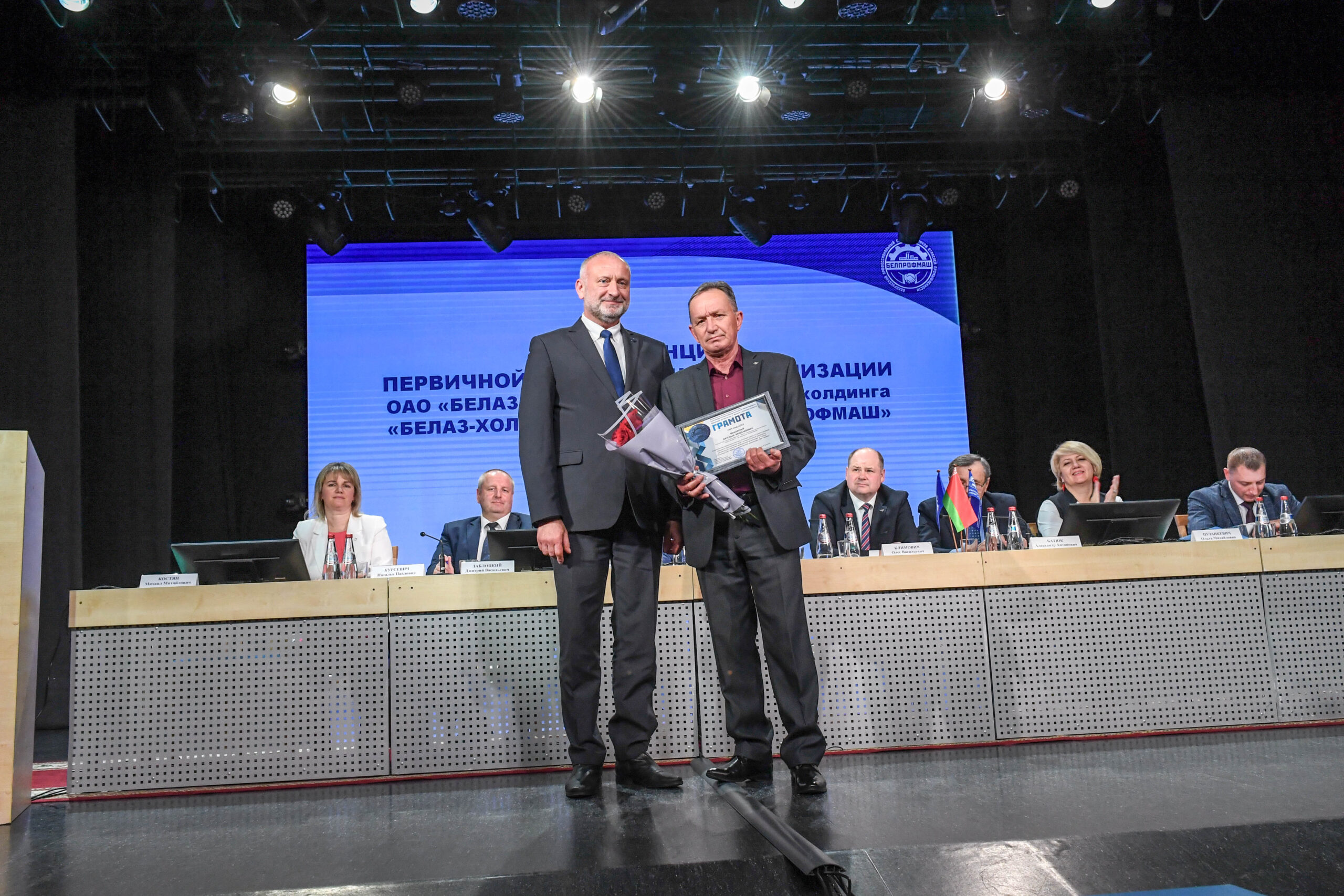 В завершение этого знакового для первичной профсоюзной организации БЕЛАЗа мероприятия прошла церемония награждения. Награды Минской областной организации и отраслевого профсоюза белазовцам вручил Михаил Костян. За личный вклад в развитие профсоюзной организации и в связи с 75-летием предприятия и профсоюзной организации грамоты обкома удостоен начальник цеха главного конвейера Вячеслав Маковский, благодарность объявлена начальнику типографии управления главного конструктора НТЦ имени А. Н. Егорова Светлане Молчановой. Благодарность профсоюза «БЕЛПРОФМАШ» объявлена юрисконсульту первичной профсоюзной организации Дмитрию Окрушкину. Почетная грамота вручена победителю областного этапа смотра-конкурса на звание «Лучший общественный инспектор по охране труда областной организации г. Минска и Минской области профсоюза «БЕЛПРОФМАШ» инженеру-технологу управления главного технолога Валентине Алейник.