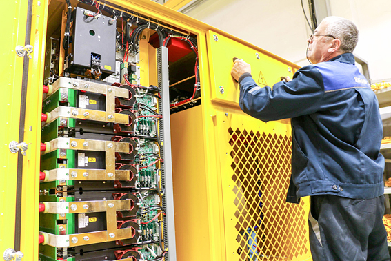 Силовая часть шкафа управления собрана на базе IGBT модулей. Микропроцессорная система управления, контроля, защиты и диагностирования, входящая в состав шкафа, позволяет обеспечить высокие энергетические и эксплуатационные показатели ЭМТ. Также из-за отсутствия в шкафу изнашиваемых деталей он требует меньших затрат при обслуживании.