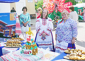 У входа во Дворец культуры БЕЛАЗа участников торжественного собрания встречали круассанами, пряниками и другой выпечкой, в том числе и работники нашего управления по торговле, приготовившие фирменную продукцию для конкурса караваев «Любимому городу посвящается».